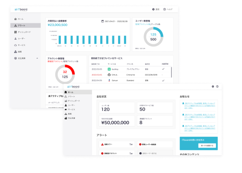 「ITboard」は、全社のSaaS利用コストを集約し、利用料金をいつでも簡単に見ることができるサービスです。わかりやすいUIで誰でも簡単に扱えるので、コスト推移も随時把握することができます。また各SaaS・各プランごとに契約更新が近づいた際にアラートで通知いたしますので、事前にSaaSプランの見直しや稟議漏れを防ぐことが可能です。
